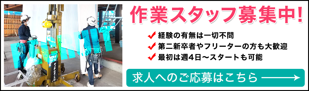 第ニ新卒・フリーターの方も大歓迎です! 弊社の求人では、第二新卒の方やフリーターの方からのご応募を歓迎しています。入社してすぐのフルタイム勤務がむずかしいようであれば、週4日からのスタートも可能です。まずはALC外壁施工などの仕事に触れていただき、「続けられそう!」を思ってくださってから正社員化を検討していただいて構いません。 昔ながらの気難しさや厳しさをなくし、現代的で快適な勤務環境づくりを進めています。事前にご相談をいただけば、休日取得も柔軟に対応しています。ご自身の働きやすいペースで、まずは飛び込んでみてください! 福利厚生を充実させています! スタッフが心から安心して仕事を続けるためには、会社によるバックアップが不可欠であると考えていますので、福利厚生にも力を入れています。 労働災害保険や上乗せ労災、建設工事保険などの完備はもちろんのこと、作業中のミスによる物損なども保険を適用させます。また会社全額負担による資格取得支援制度や、独立支援制度なども整えており、働きながらスキルアップをはかりやすい職場です。 あなたのチャレンジ精神を、弊社はしっかりと後押しします! 仲が良くチームワークは抜群です! スタッフが心から安心して仕事を続けるためには、会社によるバックアップが不可欠であると考えていますので、福利厚生にも力を入れています。 労働災害保険や上乗せ労災、建設工事保険などの完備はもちろんのこと、作業中のミスによる物損なども保険を適用させます。また会社全額負担による資格取得支援制度や、独立支援制度なども整えており、働きながらスキルアップをはかりやすい職場です。 あなたのチャレンジ精神を、弊社はしっかりと後押しします!